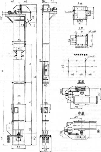 (1)傳動裝置 TD型斗提機(jī)的傳動裝置有兩種形式,分別配有YZ型減速型或ZQ(YY)型減速器。YZ型軸裝減速器直接套裝在主軸軸頭上,省去了傳動平臺、聯(lián)軸器等,使結(jié)構(gòu)緊湊,重量輕,而且其內(nèi)部帶有異型輥逆止器,逆止可靠。該減速器噪聲低,運轉(zhuǎn)平穩(wěn),并隨主軸浮動,可消除安裝應(yīng)力。(2)TD型斗提機(jī)備有四種料斗:Q型(淺斗)、H型(弧底斗)、Zd型(中深斗)、Sd型(深斗)