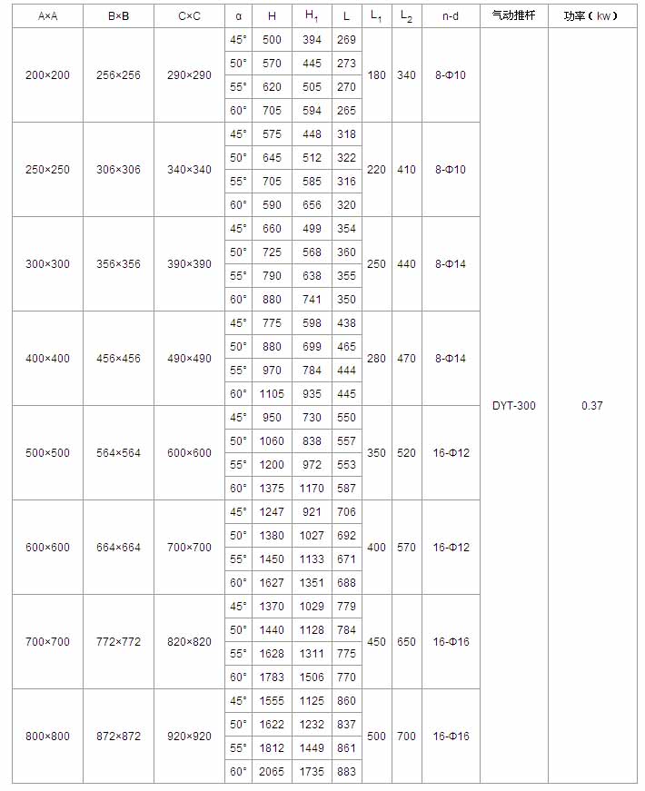A×A | B×B | C×C | α | H | L | L1 | L2 | n-d | 電動(dòng)裝置 | 功率(kw) |