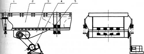 ZSW系列振動喂料機是利用兩個呈特定位置的偏心軸以齒輪相嚙合而組成激振器,裝配時必須使兩齒輪按標記相嚙合,然后通過電機驅(qū)動,使兩偏心軸旋轉(zhuǎn),從而產(chǎn)生巨大合成的直線激振力,使機體在支承彈簧上作強制振動,物料則以此振動為動力,在料槽上作滑動及拋擲運動,從而使物料前移而達到給料目的。當物料通過槽體上的篩條時,較小的料可通過篩條間隙而落下,可不經(jīng)過下道的破碎工序,起了篩分的效果。產(chǎn)品結(jié)構(gòu)及技術(shù)參數(shù)